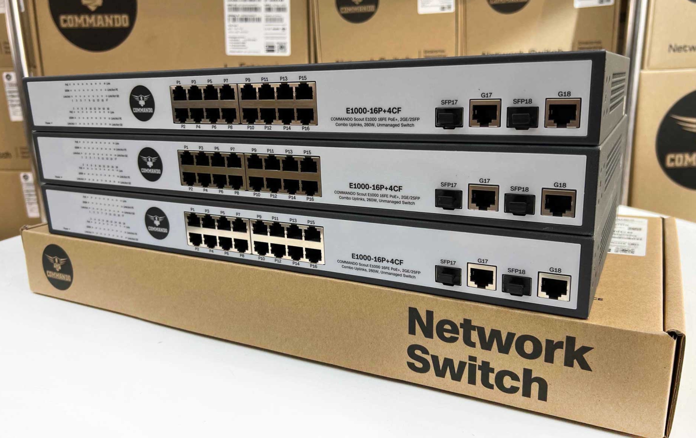 COMMANDO Scout E1000 16FE Full PoE/PoE+, 2GE/2SFP Combo Uplinks, 260W, Unmanaged Switch