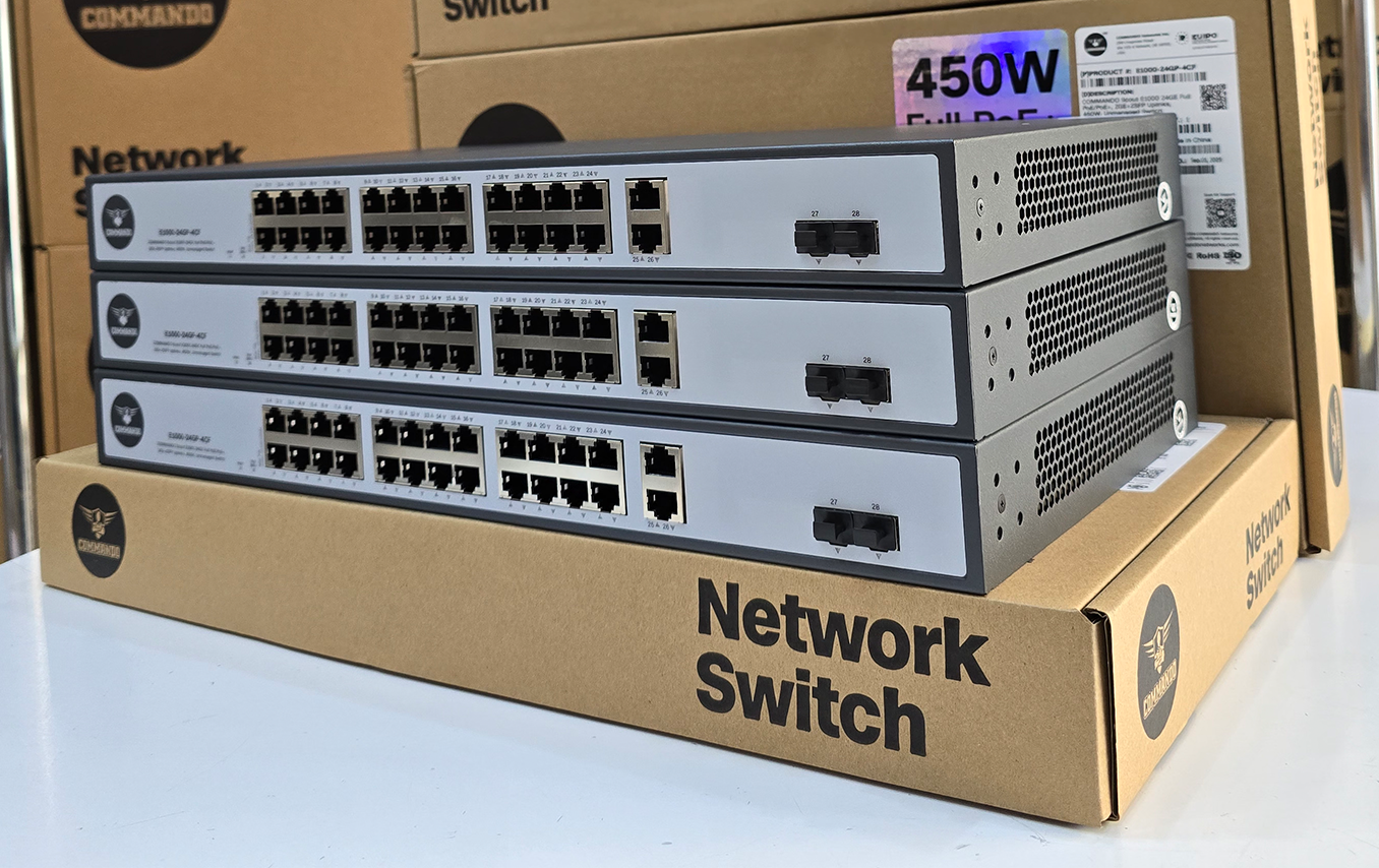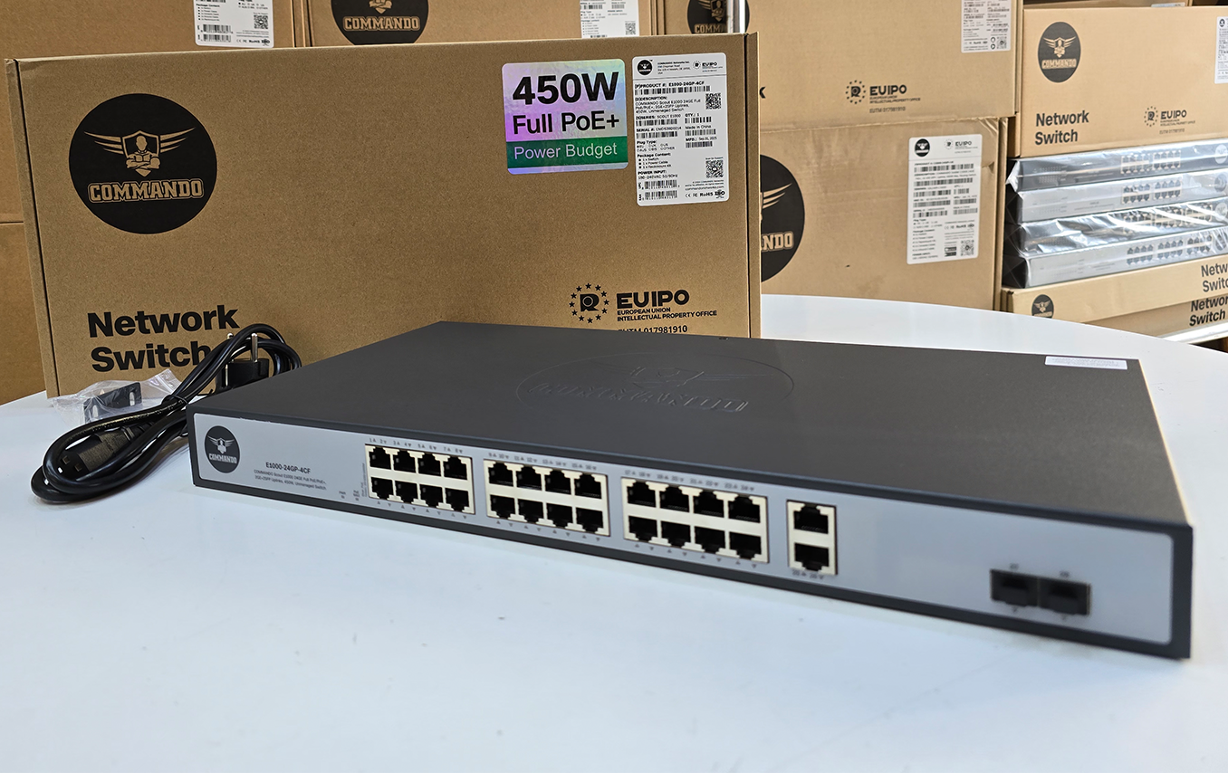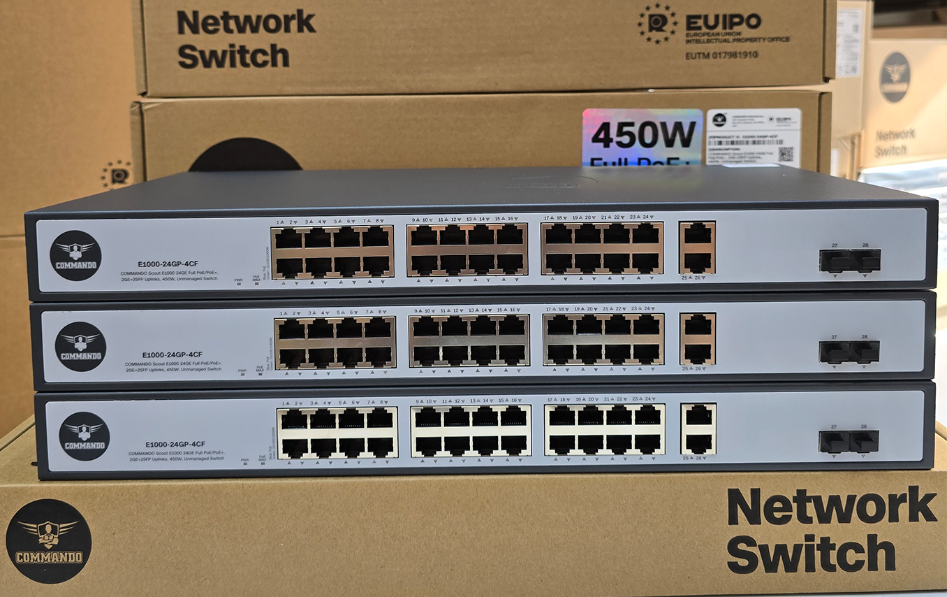 COMMANDO Scout E1000 24GE Full PoE/PoE+, 2GE+2SFP Uplinks, 450W, Unmanaged Switch