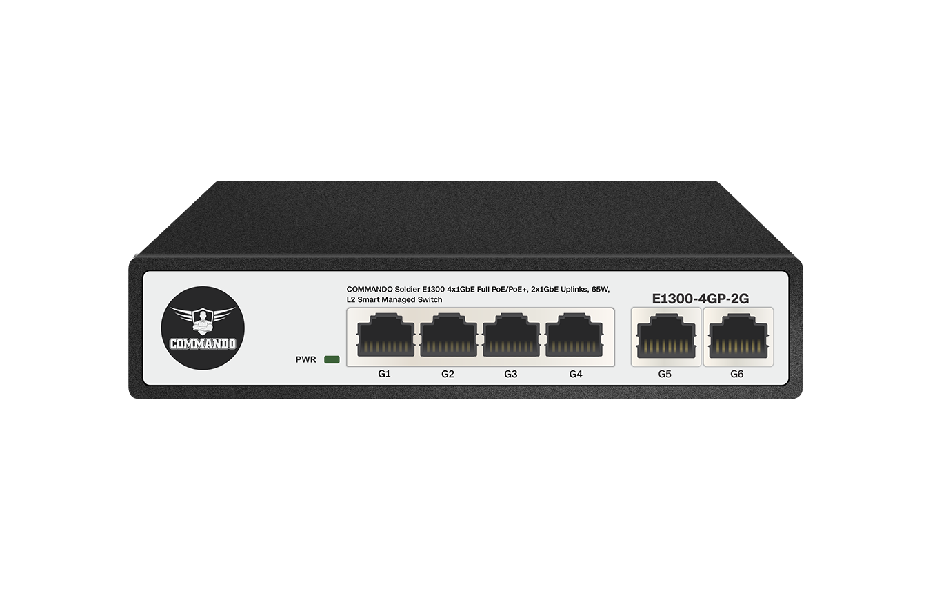 COMMANDO Soldier E1300 4x1GbE Full PoE/PoE+, 2x1GbE Uplinks, 65W, L2 Smart Managed Switch