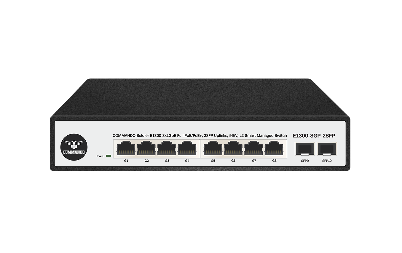 COMMANDO Soldier E1300 8x1GbE Full PoE/PoE+, 2SFP Uplinks, 96W, L2 Smart Managed Switch