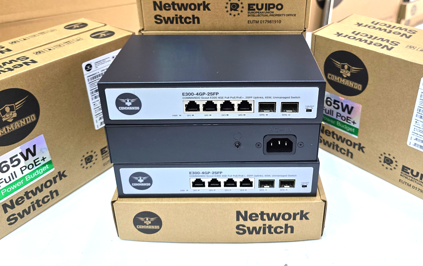 COMMANDO Scout E300 4GE Full PoE/PoE+, 2SFP Uplinks, 65W, Unmanaged Switch